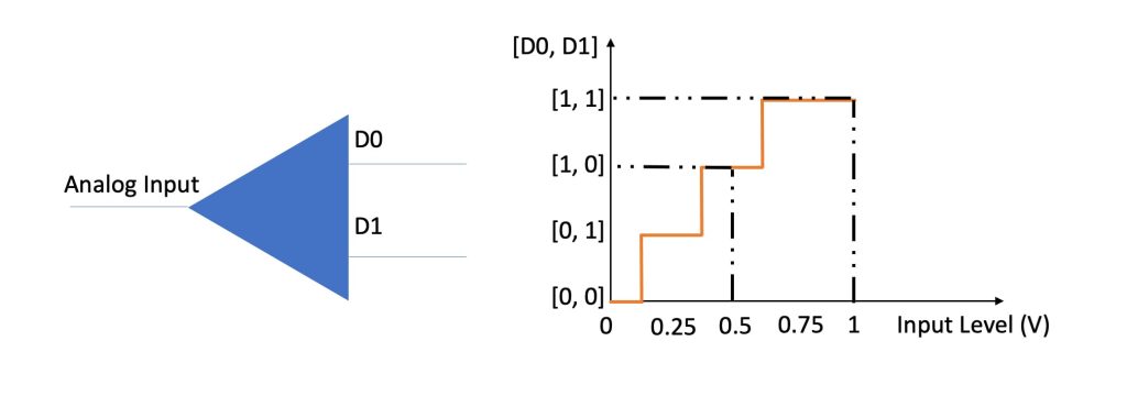 The ADC circuit measures the analog input at a certain sampling rate and converts the input voltage to a binary number based on the input level. Let us imagine that we have a 2-bit ADC with a full dynamic range from 0 V to 1V. Figure 2 shows a simplified block diagram of a 2-bit ADC (left), and the output binary number as a function of the input level.