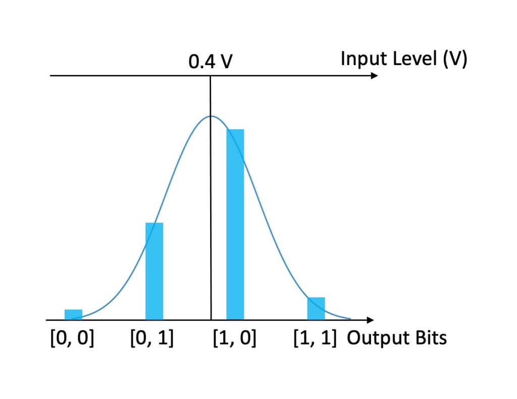 Although most of the sample points fall into the [1, 0] bin (0.5 V), a certain number of sample points give the reading of [0, 1] (0.25 V). If we take the average, the result is in between 0.25 V and 0.5 V, and leaning toward 0.5 V. Therefore, it effectively increases the resolution of the 2-bit ADC and a more accurate result can be estimated.