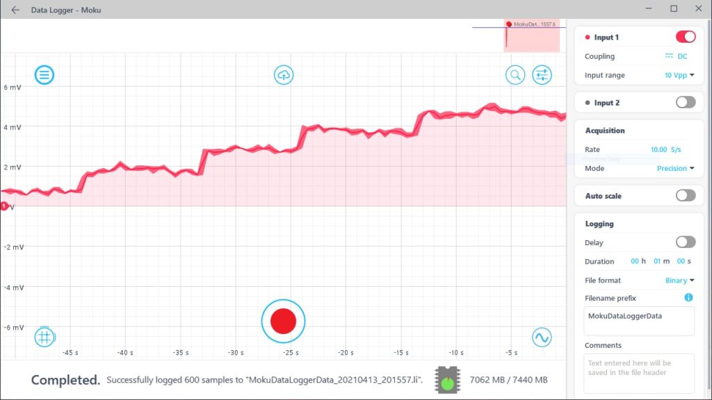 Figure 4: A step function with 1 mV increments was acquired by Moku:Go data logger.