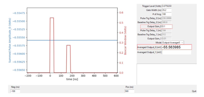 Each averager outputs the difference between the pulse integrator and the baseline integrator. Proper configuration of the output gain is essential, as incorrect settings can cause output saturation. If saturation occurs, a warning message will appear in the text box (Figure 7). To correct this, the output gain should be reduced.