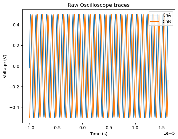 We now move to Python. We automate this measurement by configuring the Oscilloscope settings and capturing the traces. For information on the Moku Python API, please see the documentation. Each trace consists of 8192 points, controlled by the set_timebase command. To verify that the script is collecting the data as expected, we plot the results in Figure 2.