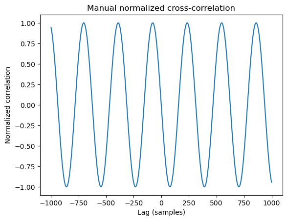 Where \(\bar{x}\) and \(\bar{y}_m\) are the means of \(x[t]\) and \(y[t+\tau]\) over the overlapping window. This gives a normalized correlation that is always between -1 and +1, independent of amplitude.