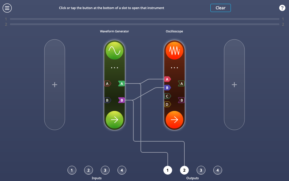 We will now work through a simple demo to test the cross-correlation function using Moku:Pro and Moku:Delta. For cross-correlation we use the Spectrum Analyzer on Moku:Delta in single-instrument mode and use Moku:Pro to generate the signals. In Moku:Pro Multi-Instrument Mode, we place the Waveform Generator in Slot 1 and the Oscilloscope in Slot 2, as seen in Figure 4. This allows us to monitor the output from the Waveform Generator in the time domain, while Delta simultaneously monitors the frequency domain.