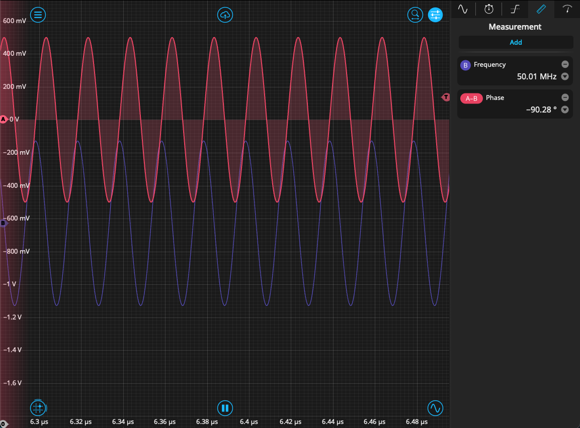 Opening the Waveform Generator, we create two sine waves with 50 MHz frequency and a relative phase of 90°. We synchronize the phase and move to the Oscilloscope to view the signals in the time domain. As can be seen in Figure 5, the signals are matched in amplitude with a phase offset between them.