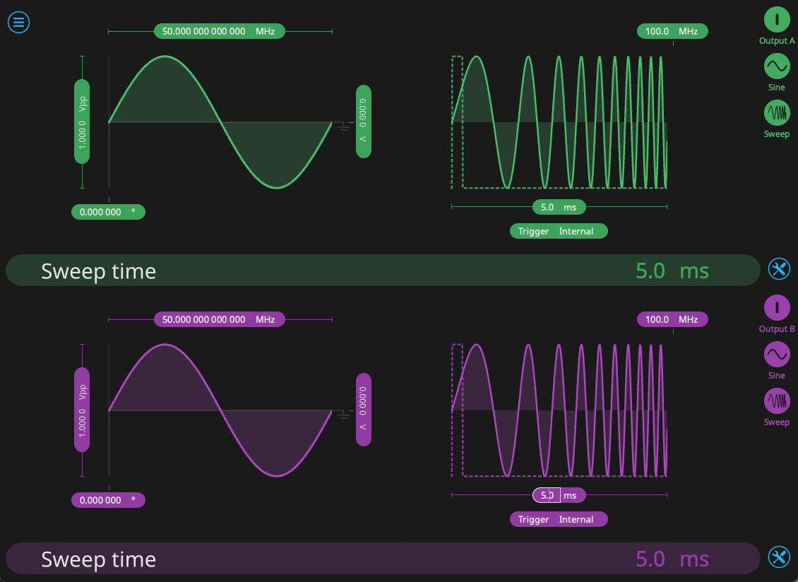 To show how cross-correlation can determine the temporal sameness of two signals, we return to the Waveform Generator and generate two chirp pulses, ranging from 50 MHz to 100 MHz. The configuration is seen in Figure 7. Both signals begin at 50 MHz and sweep in sync over a period of 5 ms.