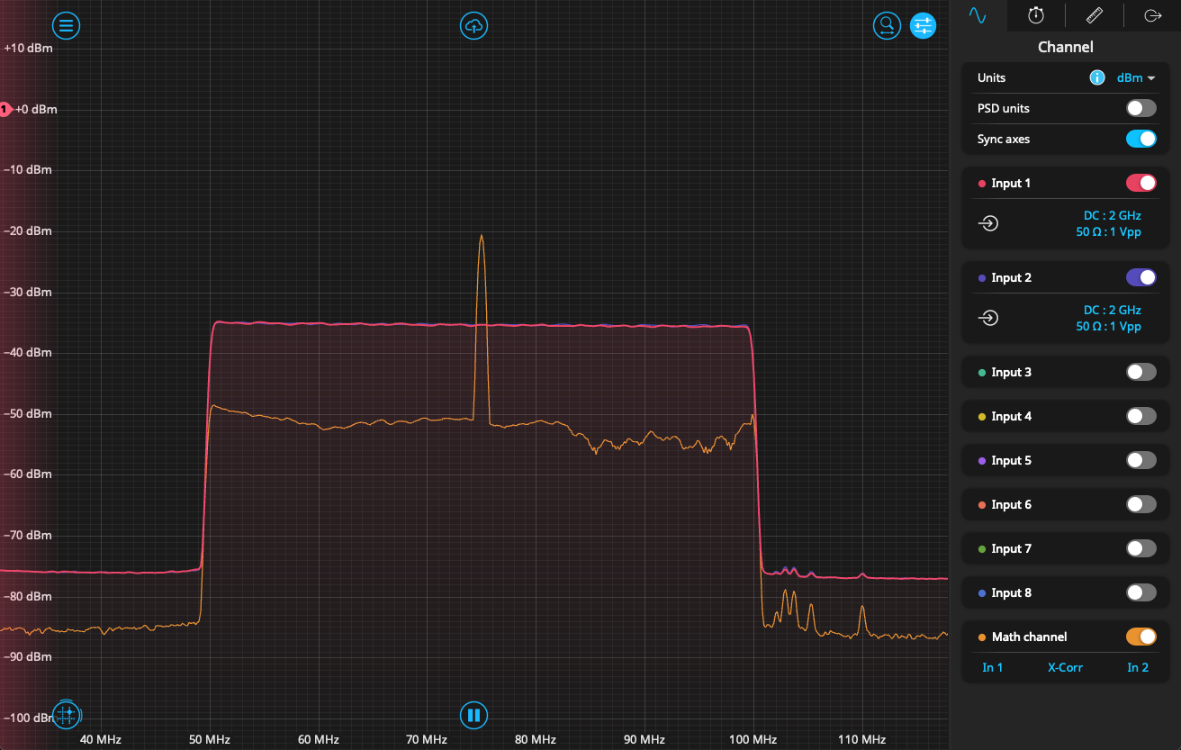 Looking at the output of the Moku Spectrum Analyzer, we see that both signals are visible as a plateau in frequency space, with sharp dropoff below 50 MHz and above 100 MHz. Both sweeps appear close to identical, overlapping neatly in the plot, while the calculated cross-correlation indicates that the signals overlap in time.