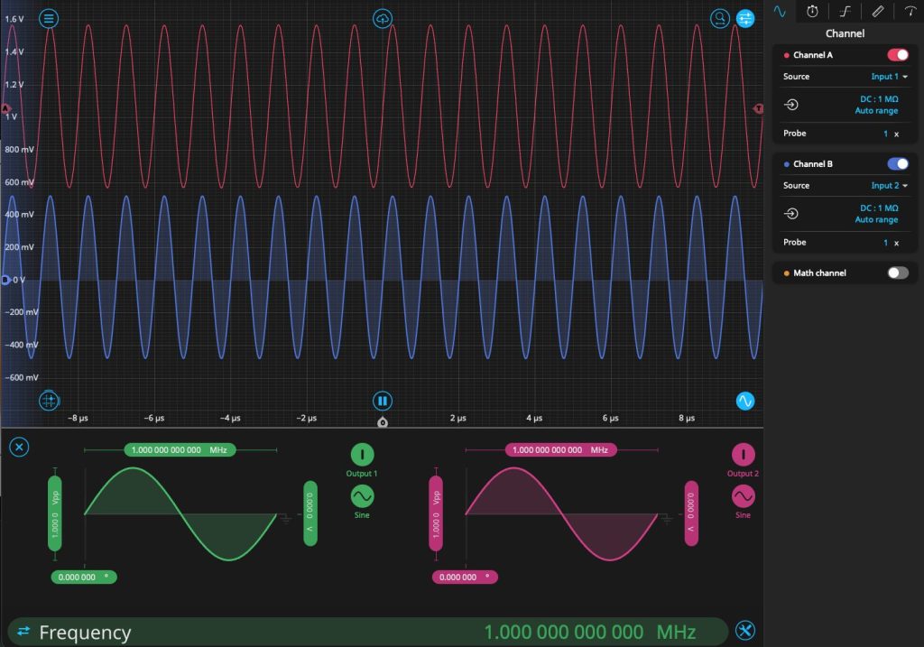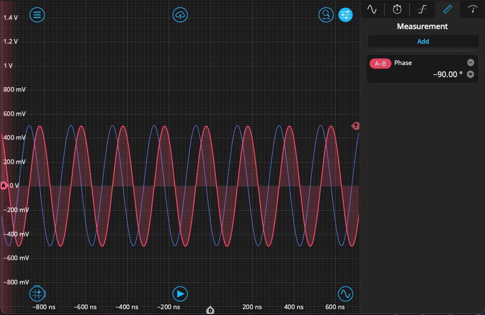 Opening the Waveform Generator, we create two sine waves with a 5 MHz frequency and a relative phase of 90°. We synchronize the phase and move to the Oscilloscope to view the signals in the time domain. As can be seen in Figure 5, the signals are matched in amplitude with a phase offset between them.