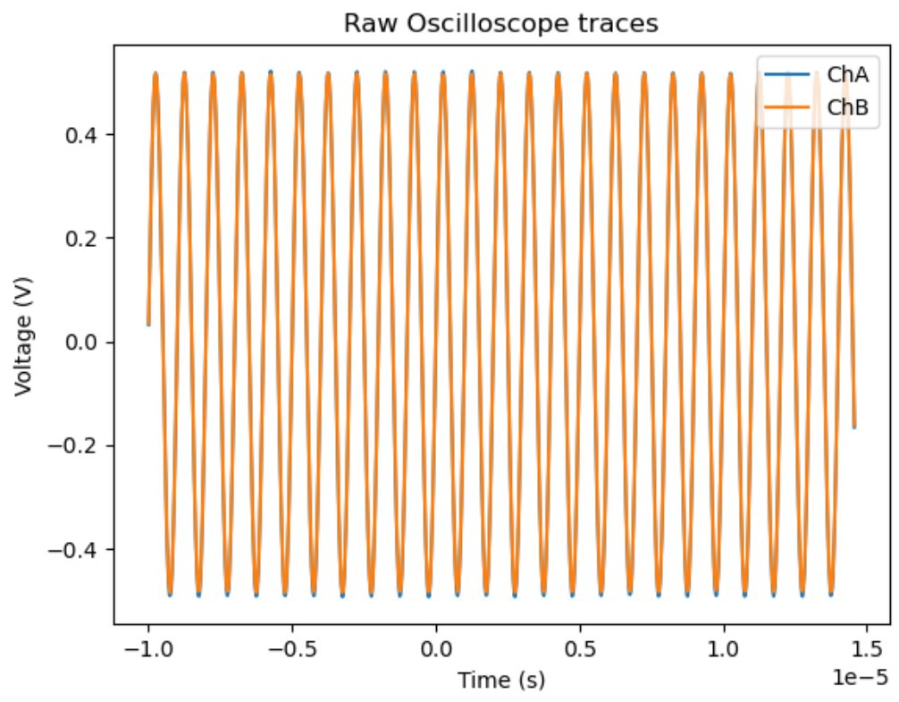 We now move to Python. We automate this measurement by configuring the Oscilloscope settings and capturing the traces. For information on the Moku Python API, please see the documentation. Each trace consists of 1024 points, controlled by the set_timebase command. To verify that the script is collecting the data as expected, we plot the results in Figure 2.