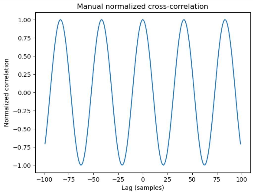 Where \(\bar{x}\) and \(\bar{y}_m\) are the means of \(x[t]\) and \(y[t+\tau]\) over the overlapping window. This gives a normalized correlation that is always between -1 and +1, independent of amplitude.