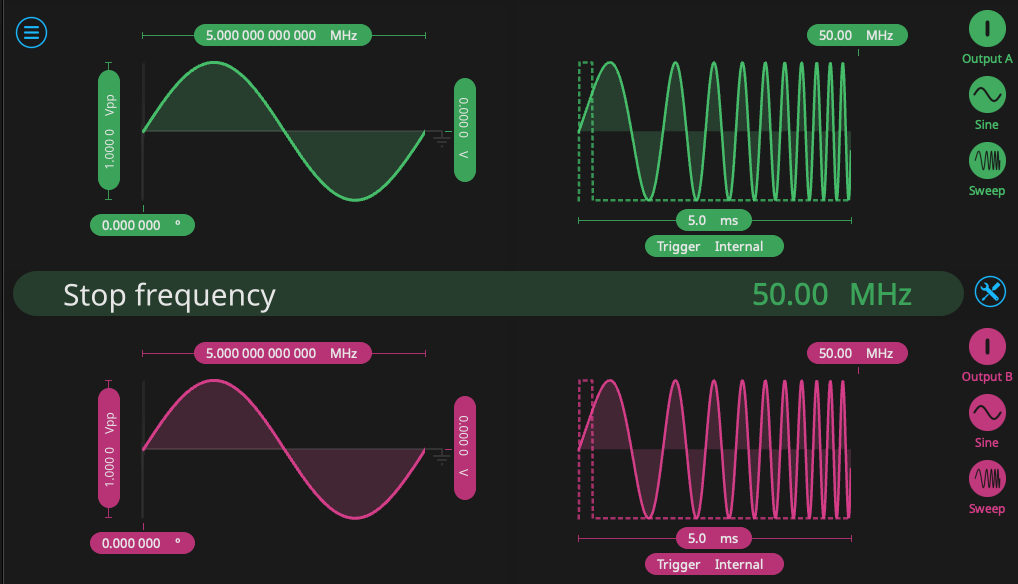 As we determined in the previous section, this feature takes the magnitude of the calculated cross spectrum and discards the phase information, meaning that the 90° phase difference between the two signals is not reflected. To show how cross-correlation can determine the temporal sameness of two signals, we return to the Waveform Generator and generate two chirp pulses, ranging from 5 MHz to 50 MHz. The configuration is seen in Figure 7. Both signals begin at 5 MHz and sweep in sync over a period of 5 ms.