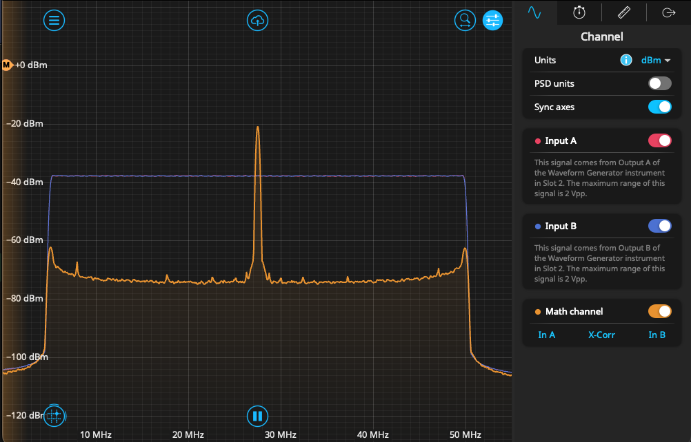 Looking at the output of the Moku Spectrum Analyzer, we see that both signals are visible as a plateau in frequency space, with sharp dropoff below 5 MHz and above 50 MHz. Both sweeps appear close to identical, overlapping neatly in the plot, while the calculated cross-correlation indicates that the signals overlap in time.