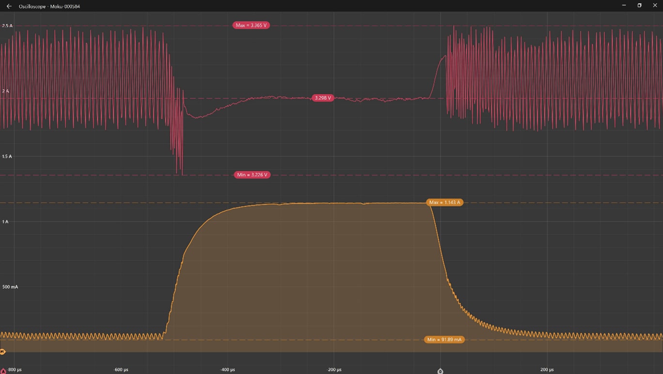 Figure 6: TPS63802 load transient response measured by Moku:Go