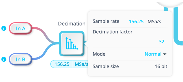 Next, configure the streaming parameters. In the Decimation block shown in Figure 3, set the sample rate to 156.25 MSa/s, which corresponds to the maximum acquisition rate for two channel streaming over the SFP. Ensure that the signal frequencies produced by the Arbitrary Waveform Generator are below half of this rate to avoid aliasing.