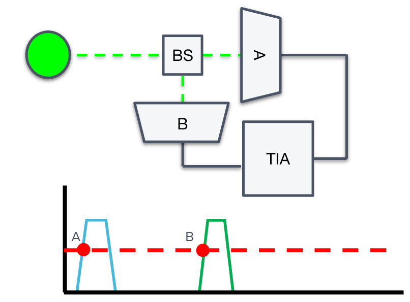 To demonstrate how to use and compute \(g^{(2)}(\tau)\), we introduce the Hanbury-Brown-Twiss (HBT) effect. In a HBT experiment (see Fig. 2), the source under test emits a stream of photons into a 50/50 beam splitter, which directs the individual photons to one of two optical paths. Two single-photon detectors (arbitrarily labeled “A” and “B”) monitor the arrival of photons traveling each of these arms. Any optical path difference between the two arms will result in a temporal offset between the arrival of photons at the two detectors. If a detector records a photon event, it generates an electrical pulse, which it passes to the time interval analyzer (TIA). The function of the TIA is to accurately timestamp and record photon events at both A and B, for later postprocessing. As we will derive in the next section, the time correlations between events A and B will determine the value of the second-order correlation function.