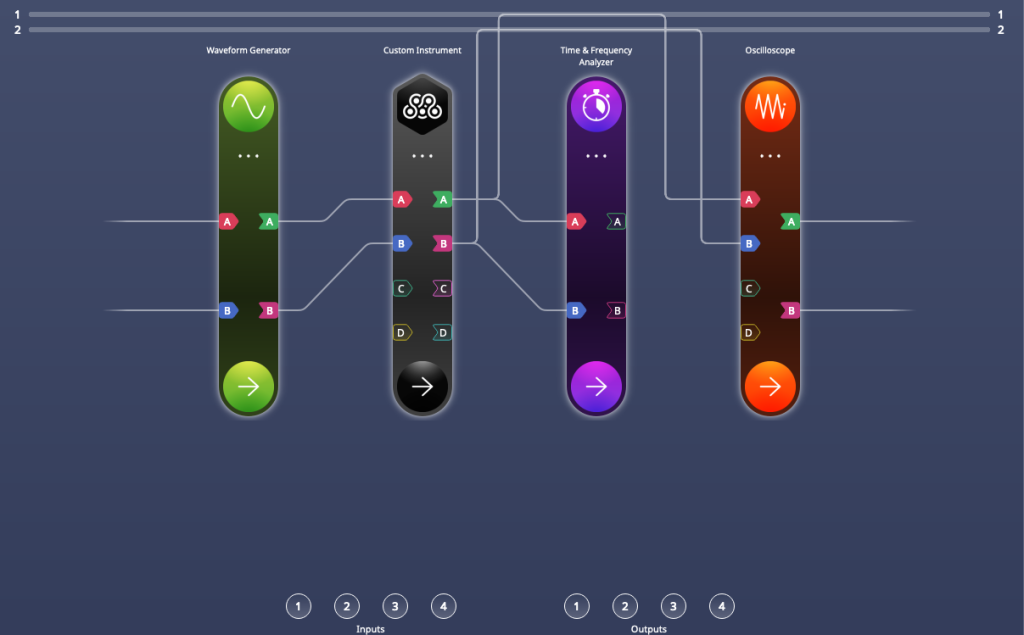 To simulate an HBT-like setup, we use an all-electrical setup with Moku:Pro. Making use of Multi-Instrument Mode, we partition the Moku FPGA into four instrument slots, each of which emulates part of a HBT measurement. See Fig. 4 for details and connection map.
