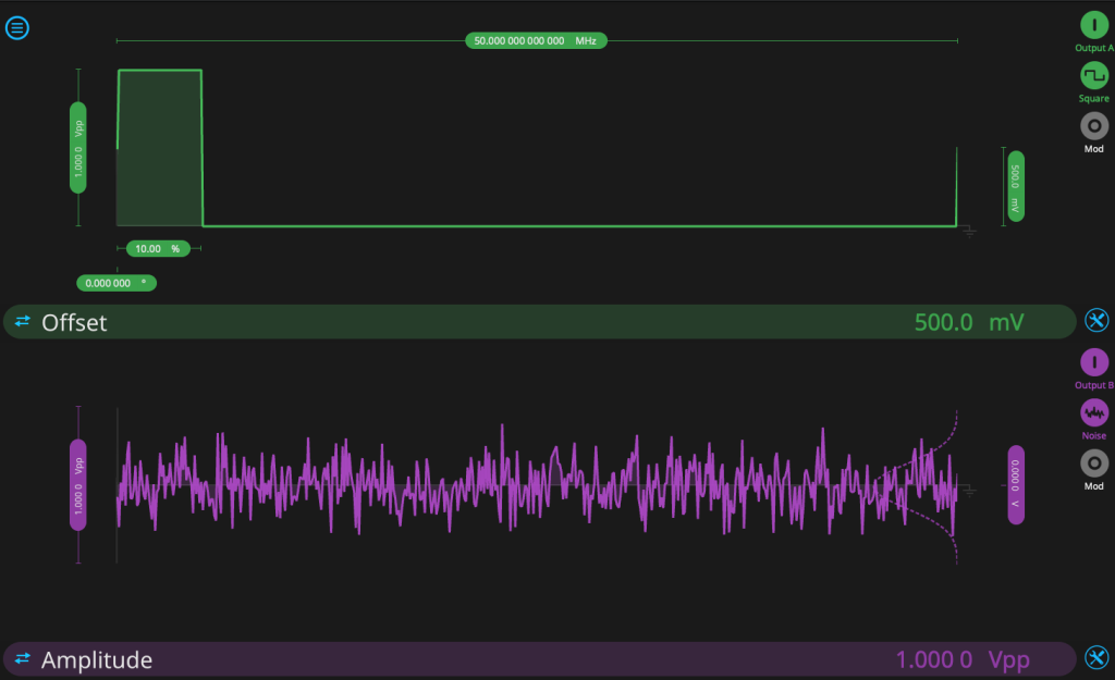 First, we configure the Waveform Generator, which will act as the pulsed laser source. From the configuration screen, we enable Output A and select a square wave output with repetition rate 50 MHz and duty cycle of 10%. We offset the output by 500 mV so that the pulse ranges from 0 to 1 V. We also enable Output B, selecting the “noise” function, and set the range to 1 V. See Fig. 5 for the Waveform Generator configuration.