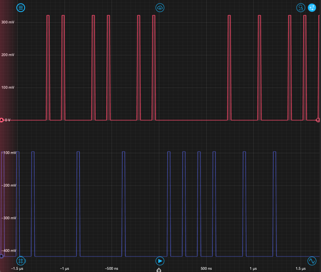 Third, we configure the Time & Frequency Analyzer to detect “photon” events occurring on inputs A and B. From the Events tab, we set the event threshold to 500 mV on a rising edge, and then measure the time interval beginning with Event A and ending with Event B. The repetition rate is high, so we can measure in Windowed Mode, with a measurement interval of 10 ms. Finally, we set up the Oscilloscope in the fourth slot to observe the output from Moku Custom Instrument. After setting up all instruments and enabling the output from the Waveform Generator, we see the output reflected on the Oscilloscope as in Fig. 6. Both channels A and B should have “event” pulses randomly distributed between them, but never overlapping.