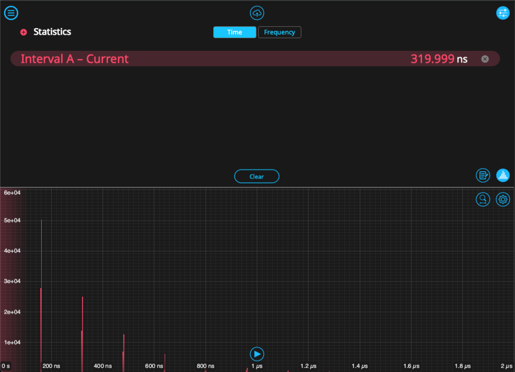 Returning the Time & Frequency Analyzer, we likewise start to see these events populate in a histogram. See Fig. 7 for an example. As established in the previous section, this histogram only reflects the time interval between nearest events and does not account for 2nd- or 3rd-order cascades. To generate \(g^{(2)}(\tau)\), we can log the raw timestamp data to a host PC by disabling the histogram and clicking on the data logger icon in the bottom right. Set the start trigger and collection time, then click the red button to begin logging. After logging, click the cloud icon, then select the most recent data file. Make sure the format is set to “NumPy” format, then send it to your destination of choice. In the next section, we will use a Python script to calculate \(g^{(2)}(\tau)\).