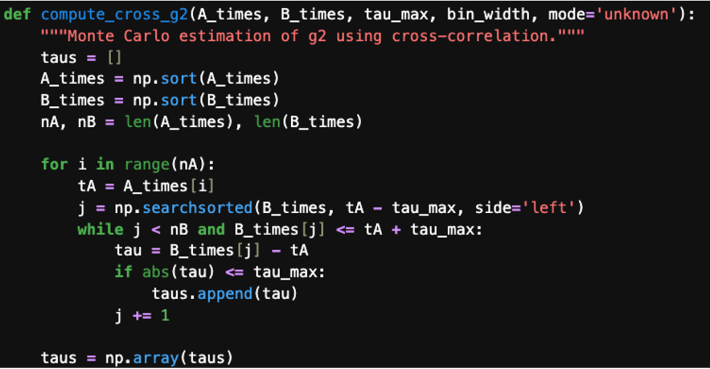 For this reason, \(k(\tau)\) is not typically used to calculate \(g^{(2)}(\tau)\) directly. Instead, one must manually count each explicit coincidence between events A and B, up to some maximum time. In pseudo-code, the process is: