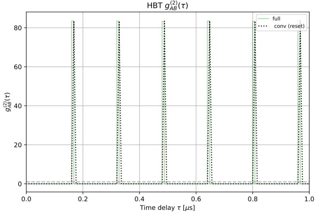 Where \(K^{(n)} (\tau)\) is the nth self-convolution of the first-order histogram \(K(\tau)\). To verify that both computational methods return approximately the same answer, we plot both as a function of delay time, seen in Fig. 9. We see that \(g^{(2)}(\tau)\) exhibits sharp spikes at regular intervals, indicative of a regularly spaced pulse sequence and common in quantum optics experiments with pulsed sources.