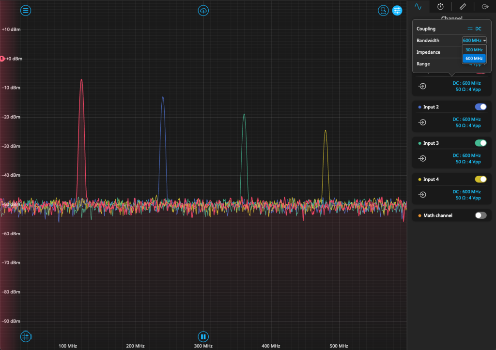 In addition to the existing signal conditioning options on the Moku:Pro analog frontend, users now have the ability to switch the frequency of the input lowpass filter between 300 and 600 MHz. This allows users working at frequencies below 300 MHz to reduce the effects from higher frequency noise. This change also increases the range of Phasemeter and Spectrum Analyzer from their previous 300 MHz, with both instruments now measuring frequencies up to 600 MHz. You can find this option alongside other Input options (in single instrument mode), or by clicking on the input port number (in Multi-Instrument Mode).