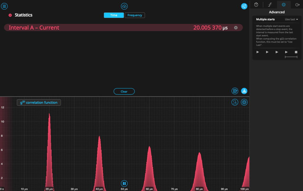 For other types of time interval measurements, users can now specify how the Time & Frequency Analyzer handles multiple starts, using either the first or the last “start” event before a stop event is detected. Find this option under the “Advanced” tab on the configuration screen.
