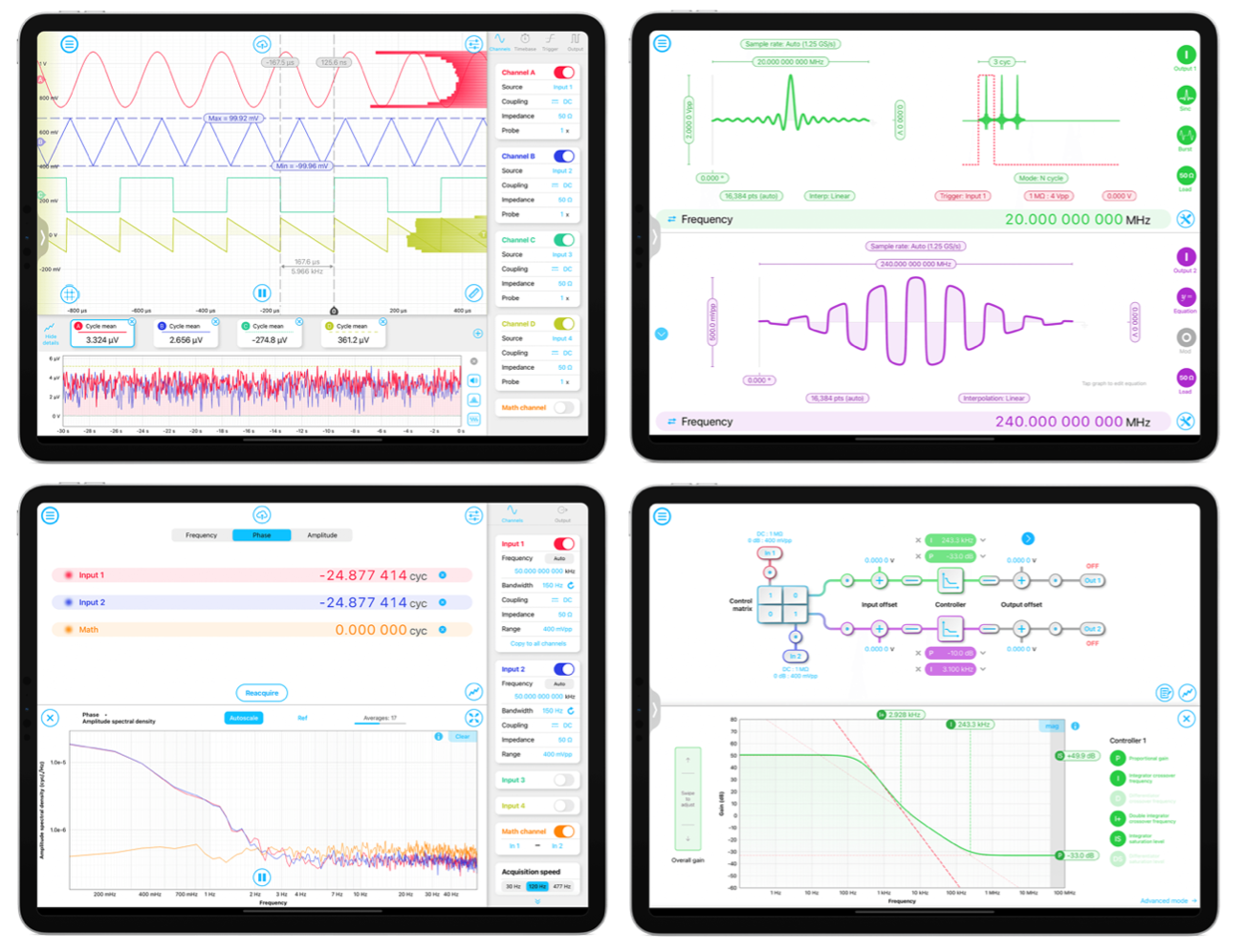 When Liquid Instruments launched Moku:Lab several years ago, we took the opportunity to rethink the entire user experience. We work a lot in large (optics) labs and wanted a UI decoupled from the hardware so that we could bring it with us as we move around the lab tweaking things. A tablet was a great form factor. Rather than port the conventional test equipment user interface to a tablet, we set out to bring the best of modern user interface design to test equipment.