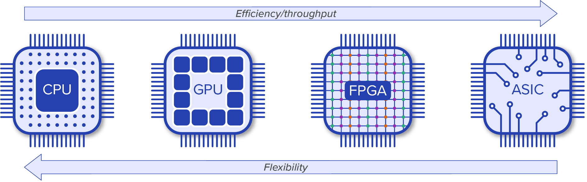Many kinds of processing chips could be used to implement the DSP in an IoC device, so why has the FPGA emerged as the go-to chip? There are several common classes of chips capable of fast signal processing such as CPUs (Central Processing Units), GPUs (Graphical Processing Units), and ASICs (Application Specific Integrated Circuits). Each of these chips is the result of a different optimization. Figure 3 shows these chips arranged on a spectrum of increasing efficiency and decreasing flexibility. Starting from the left is a CPU, which is the king of flexibility and is the work horse of general-purpose computing. A CPU is probably working away inside the device you are reading these words on. Moving to the right we come to a GPU, which is less flexible but optimized for high-throughput parallel processing with many more cores (perhaps 100x more) than a typical CPU. As the name suggests, a GPU’s primary purpose was to perform calculations related to 3D computer graphics.